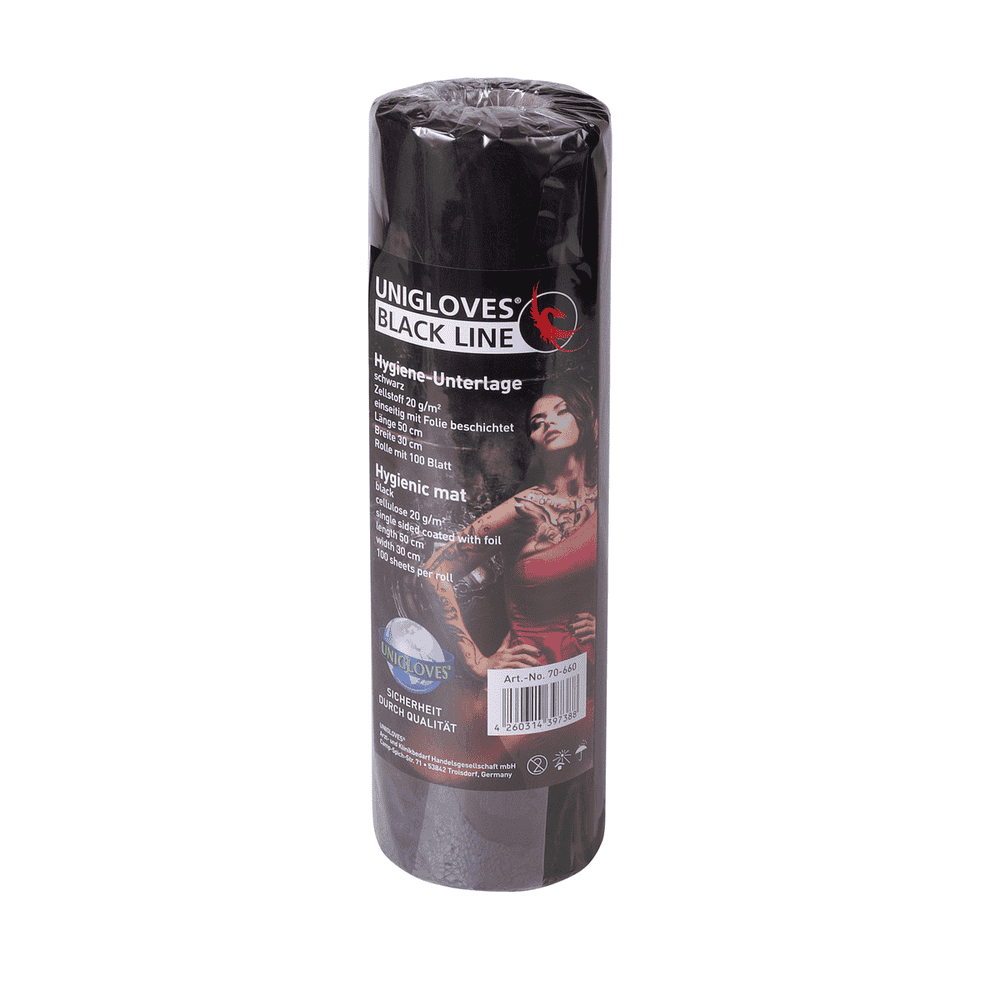 Die Unigloves® Hygieneunterlage besteht aus schwarzem Zellstoff mit einseitiger PE-Beschichtung eignet sich dazu Bereiche abzudecken die sauber bleiben sollen.