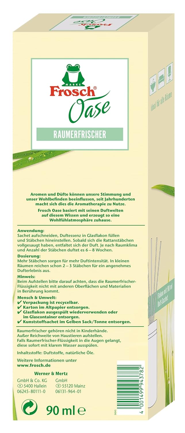 Die Frosch® Oase Raumerfrischer Nachfüllpackungen ermöglichen es, den Frosch® Oase Raumerfrischer bequem weiterzuverwenden. Die sorgfältig komponierten Duftwelten basieren auf natürlichen Ölen und schaffen eine harmonische Duftkulisse, die das Wohlbefinden positiv beeinflussen kann. Ob Zuhause oder am Arbeitsplatz – die Nachfüllvarianten bringen frische, sanfte Aromen zurück in jeden Raum, ohne dass ein neuer Glasflakon benötigt wird.Jede Nachfüllung enthält ein 90‑ml‑Duftsachet sowie passende Rattanstäbchen, die den Duft gleichmäßig und langsam abgeben. Abhängig von der Raumgröße, dem Klima und der Anzahl eingesetzter Stäbchen verbreitet sich der Duft für etwa 6 bis 8 Wochen. Die Rezeptur kommt ohne Mikroplastik und ohne tierische Inhaltsstoffe aus und unterstreicht den umweltschonenden Charakter der Nachfüllpackungen.Vorteile auf einen Blick:Natürliche Duftkompositionen: Mit hochwertigen Ölen für eine angenehme AtmosphäreNachhaltige Alternative: Nachfüllpackungen reduzieren Müll und schonen die UmweltLanganhaltender Duft: Je nach Einsatz der Rattanstäbe rund 6-8 Wochen DuftabgabeSanft und bewusst: Frei von Mikroplastik und ohne tierische InhaltsstoffeVielseitige Auswahl: In verschiedenen Duftvarianten erhältlichAnwendung:Das Duftsachet in den vorhandenen Glasflakon füllen, anschließend die gewünschten Rattanstäbchen einsetzen und die Duftintensität durch die Anzahl der Stäbchen bestimmen. Ideal zur Weiterverwendung bestehender Frosch® Oase Raumerfrischer.90 ml / Packung8 Packungen / Karton