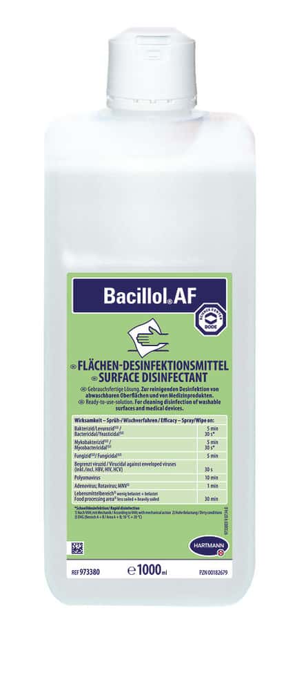 HARTMANN Bacillol® AF ist ein alkoholisches Schnelldesinfektionsmittel zur Desinfektion alkoholbeständiger Flächen mit umfassender Wirkung und rückstandsfreier Auftrocknung.