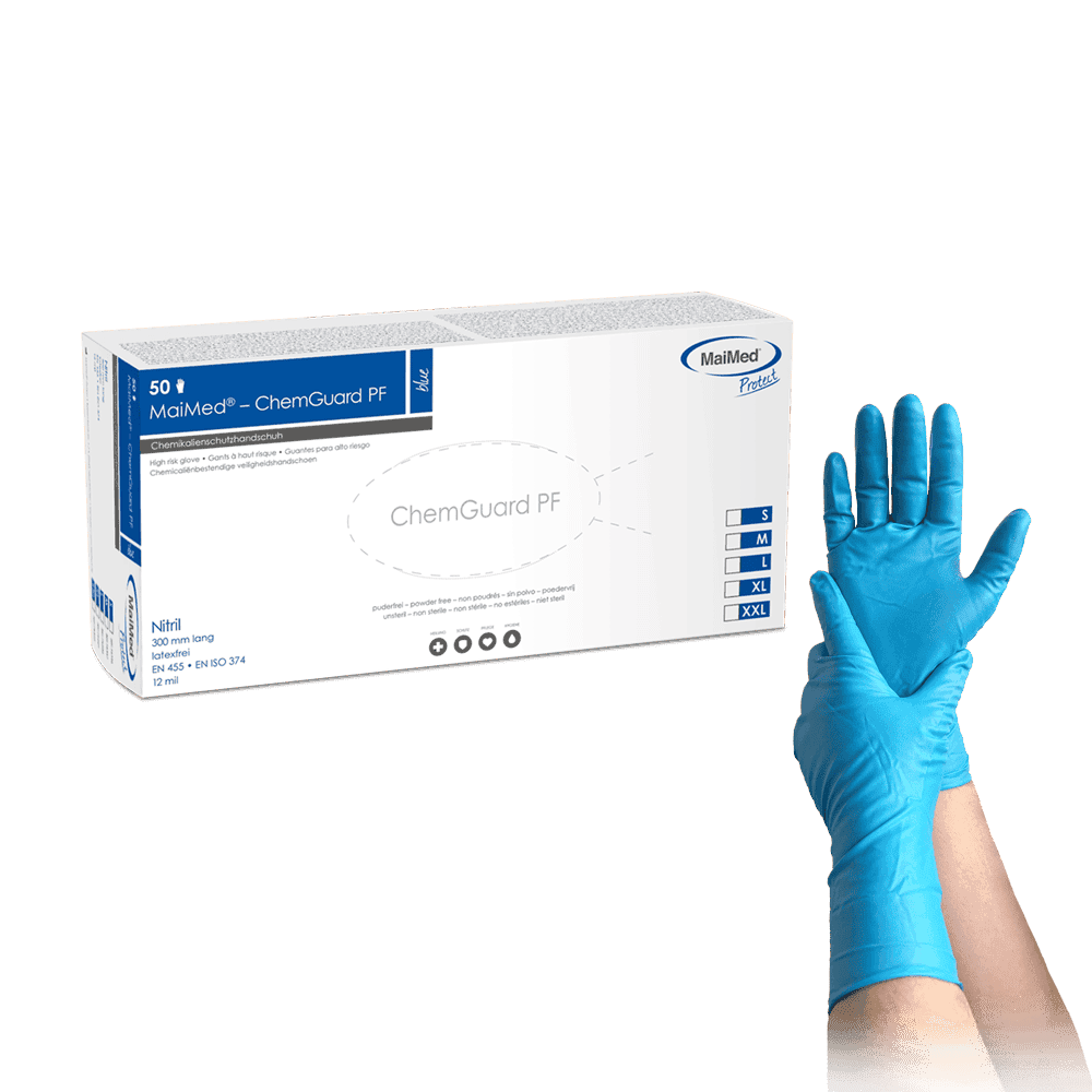 Der MaiMed®ChemGuard PF ist ein hochwertiger und puderfreier Nitrilhandschuh. Mit einer Schaftlänge von ca. 300 mm und einer Materialstärke von 12 mil (mehr als doppelt so dick wie ein Standard-Nitrilhandschuh) ist er sehr robust und widerstandsfähig. Seine stark texturierte Oberflächenstruktur bietet sowohl im trockenen als auch im nassen Zustand eine optimale Griffigkeit und Haftung. Der Handschuh erfüllt höchste Sicherheitsansprüche im Umgang mit gefährlichen Chemikalien. Zu den Haupteinsatzbereichen gehören Industrie/Handwerk mit Schwerpunkt chemische Industrie, Lebensmittelindustrie, Laborarbeit/Forschung und Gebäudereinigung.